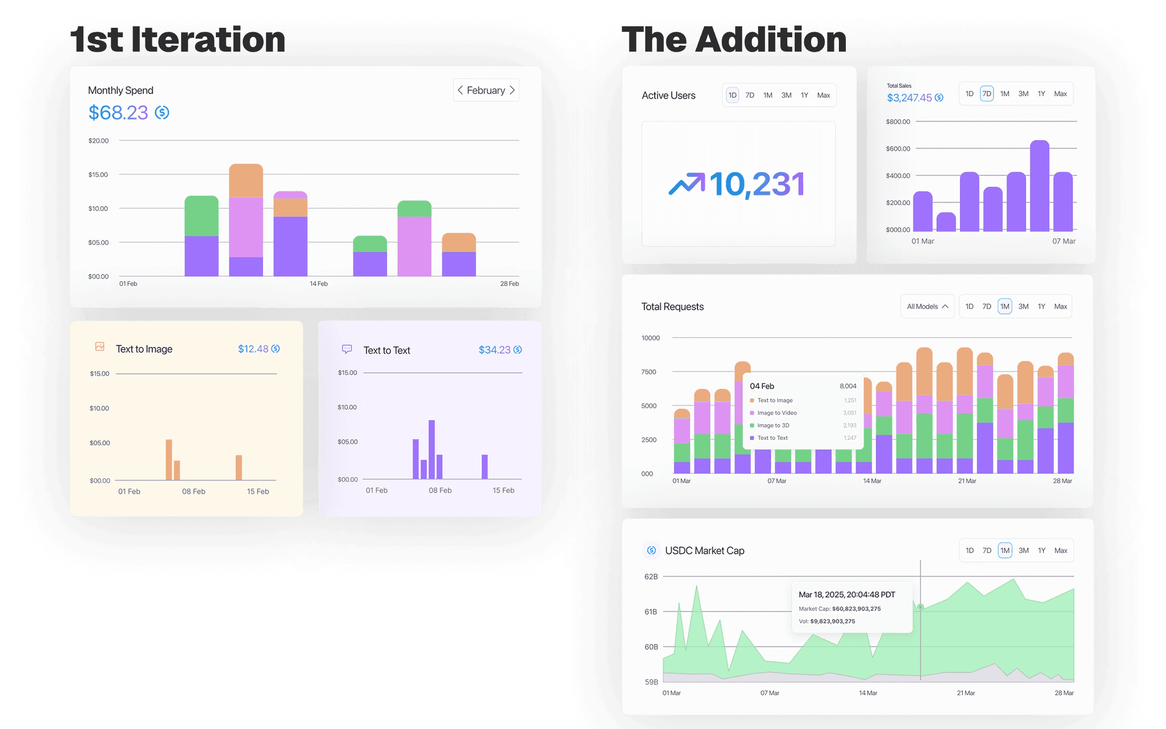 While presenting my first iteration with domain experts at Circle, we discussed that revenue alone lacks operational context, and agreed that developers need to be able to correlate usage, users, and time to build intuition. With this feedback, I designed an additional page with more time-based narratives connecting user activity, usage, and financial outcomes.