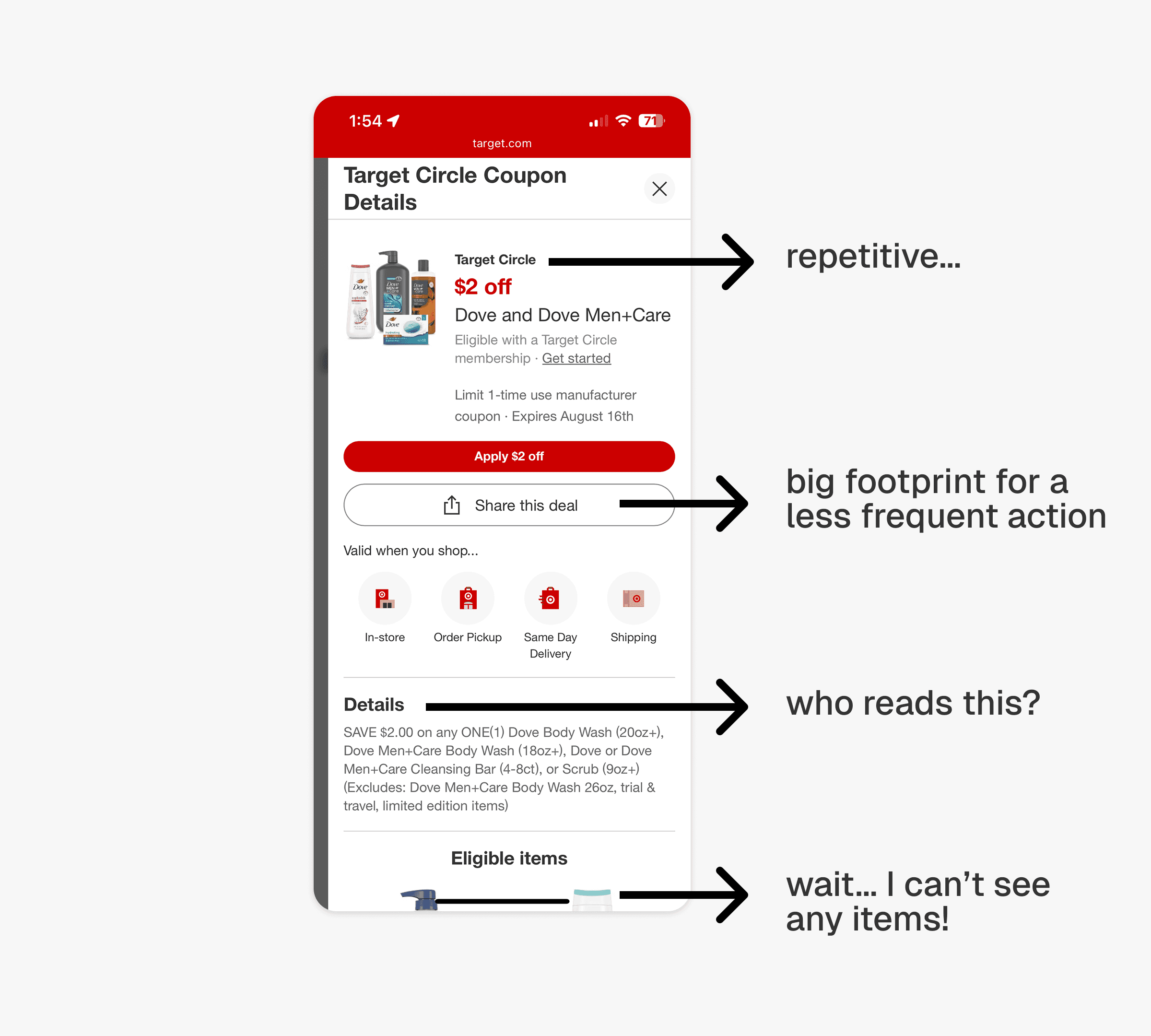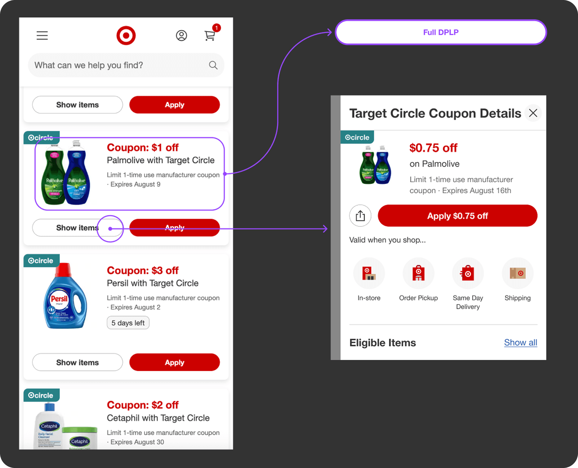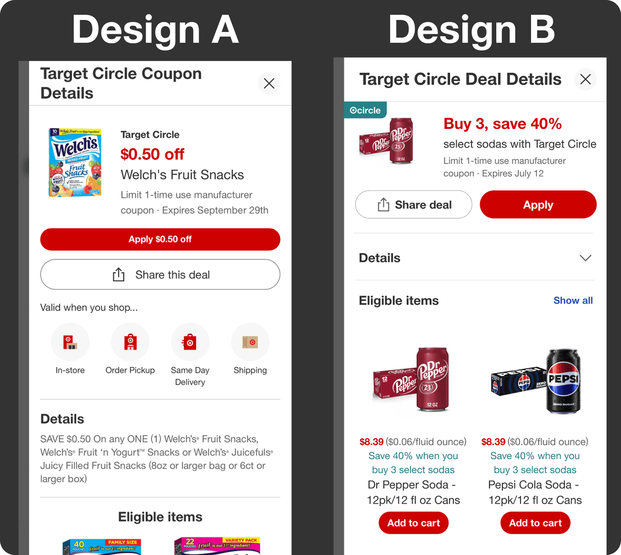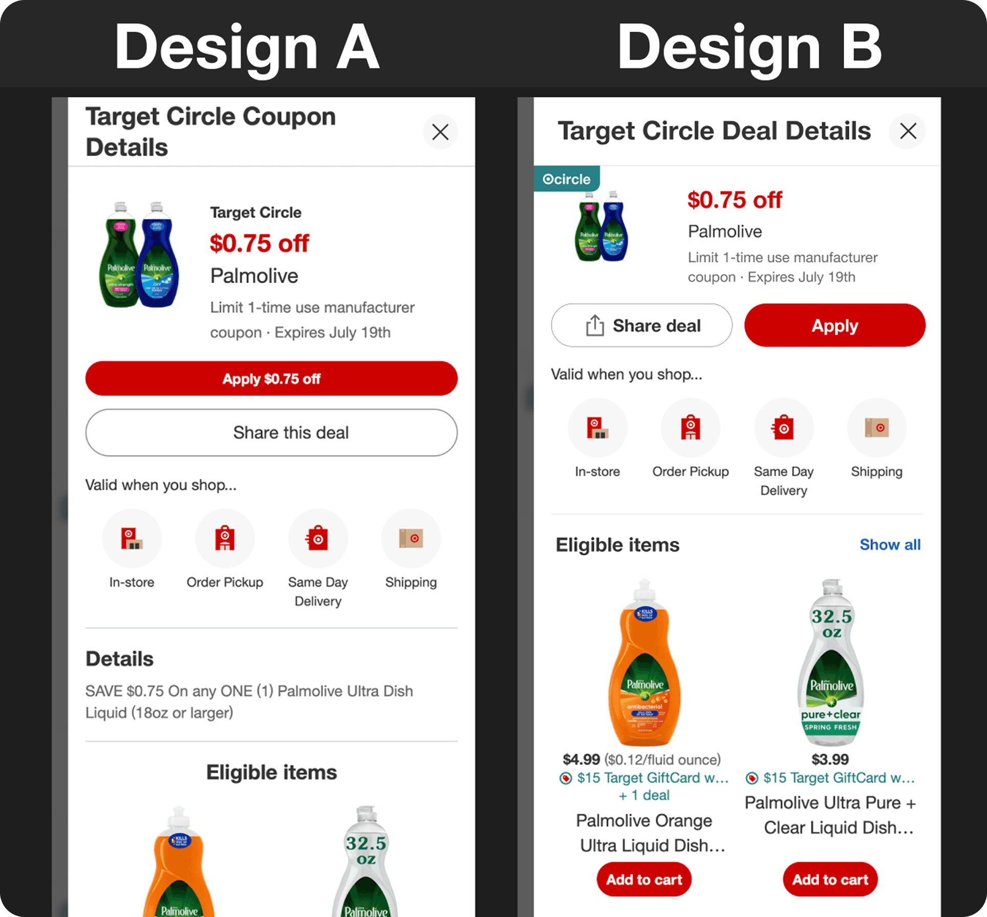As part of my UX design internship at Target, I worked on the Deals team during their transition to an offer-led shopping experience that aims to help guests discover and act on promotions more efficiently. While the new offer-first model surfaced more deals, it also introduced friction: guests often had to leave the deals grid to browse eligible products, resulting in repetitive navigation and comparison fatigue.