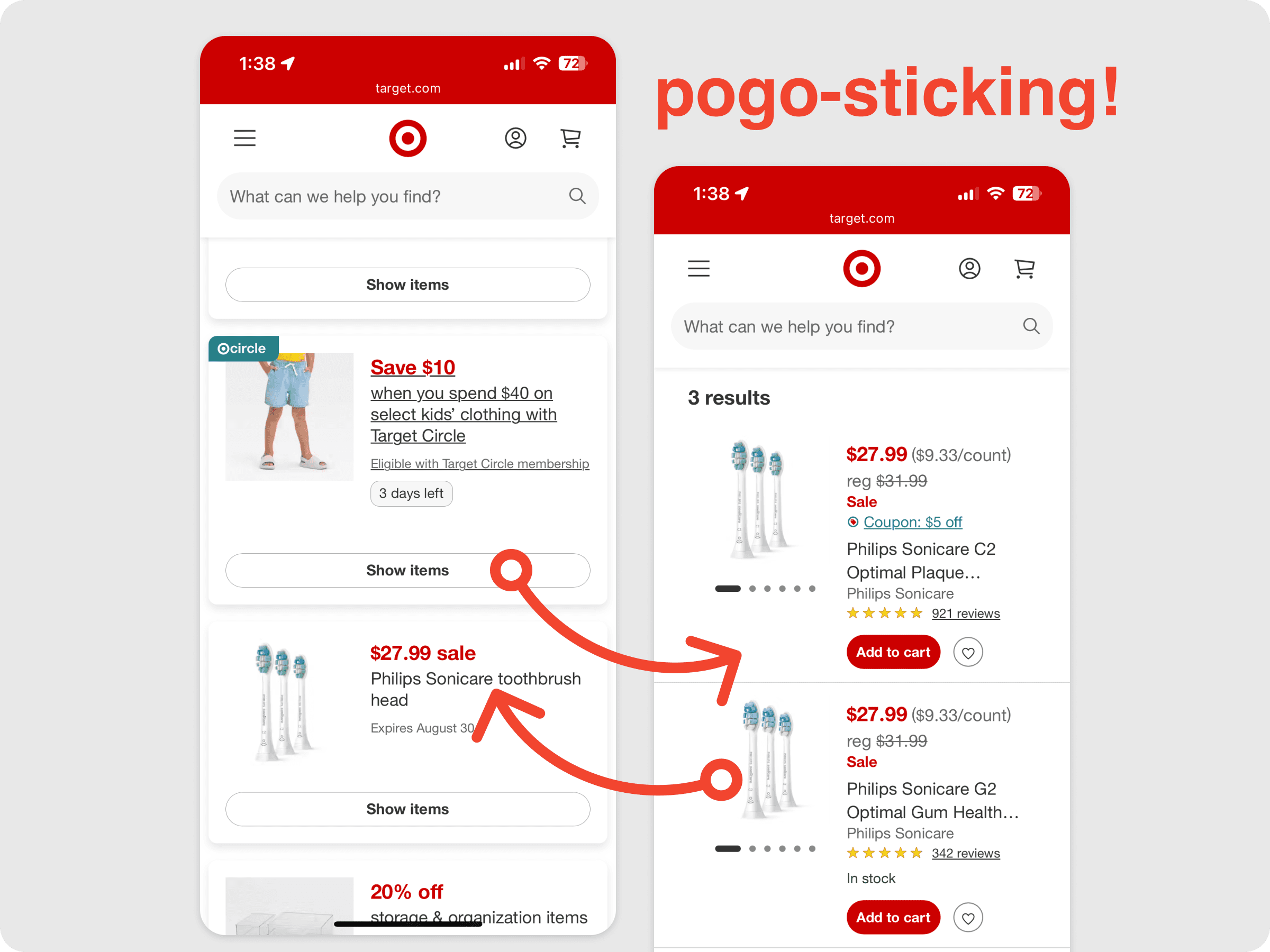 Guests frequently “pogo-sticked” between the deals grid and full product listing pages