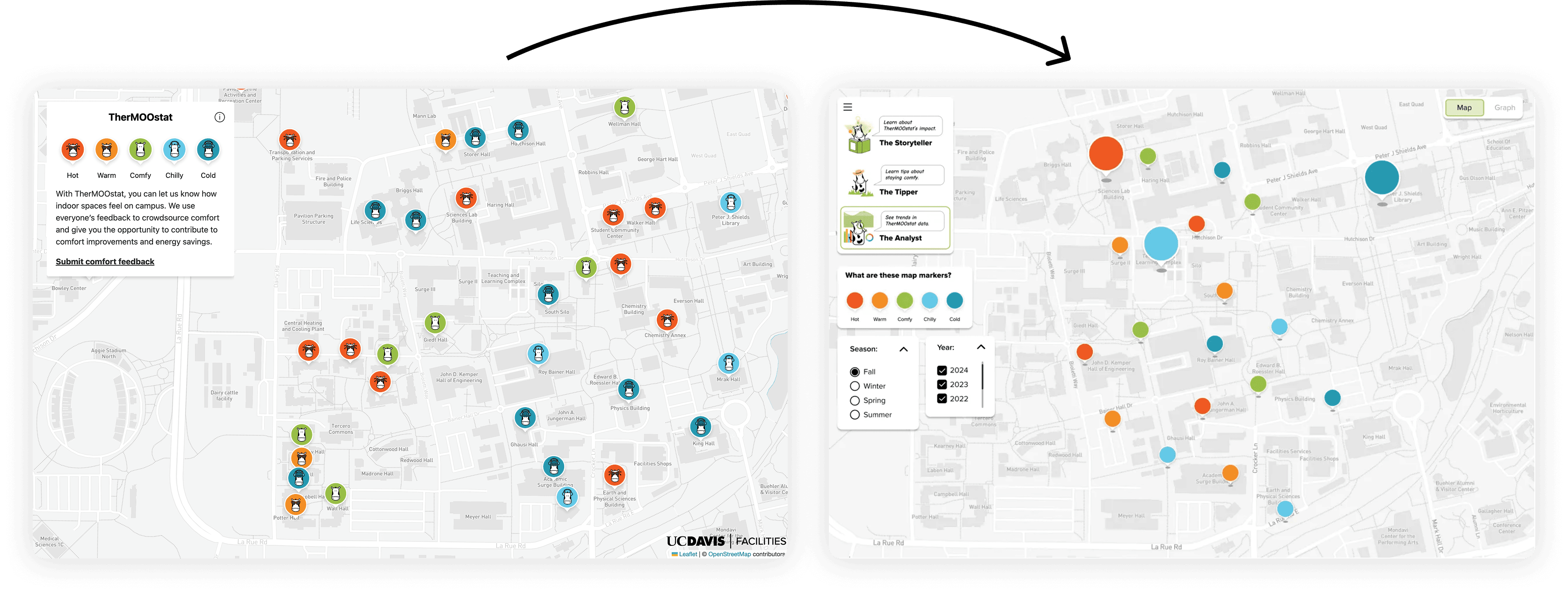 TherMOOstat is a campus tool that allows students to submit classroom comfort feedback to improve heating and cooling efficiency across UC Davis buildings. While the platform collected valuable data, students struggled to understand how their feedback translated into real impact on campus sustainability, limiting engagement and trust.